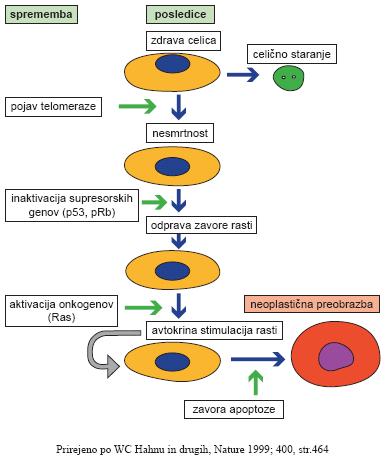 Na skici vidimo poenostavljene stopnje maligne transformacije. Na prvi stopnji povzroči pojav telomeraze nesmrtnost doslej zdrave celice in ji prepreči, da bi se postarala. Na drugi stopnji tega procesa zaradi inaktivacije tumorskih zaviralnih genov (p53, pRb) ni več običajne rastne zavore in celice se vse hitreje delijo. Na tretji stopnji se aktivirajo onkogeni, ki že nebrzdano rast samo še pospešijo. V celici začno nastajati rastni faktorji, za katere celica že ima receptorje, ali pa na novo nastanejo receptorji za tiste rastne faktorje, ki jih celica že prideluje. Novonastali proces imenujemo avtokrina stimulacija rasti. Celica se je tako že po nekaj stopničkah prelevila iz spodobne in nadzorovane živalice v agresivno, ves organizem ogrožujočo zverinico.