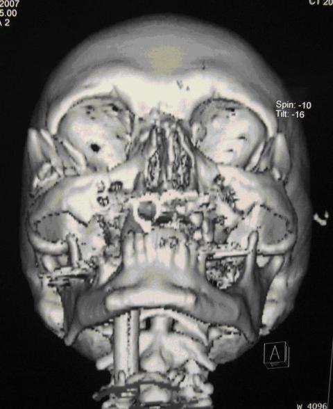 Slika 1: Tridimenzionalna CT rekonstrukcija hude poškodbe srednje tretjine obraznega skeleta, ki je v celoti vdrta, zlomi zajemajo obe orbiti, nos, zgornjo čeljust in lična mostiča