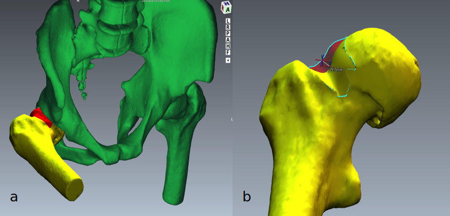 b – računalniški program izračuna volumen kosti na prehodu glavice v vrat stegnenice, ki ga je treba med posegom odstraniti, ter globino, do katere moramo kost zbrusiti