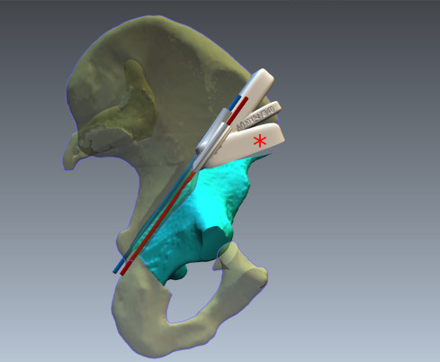 Slika 5. Računalniški prikaz uporabe 3D printanega nosilca (označen z živo rdečo zvezdico *) za natančno izvedbo vertikalne osteotomije črevnične kosti