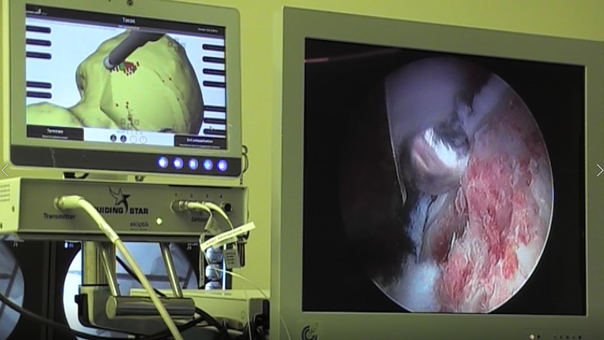 Kirurg med artroskopkim preoblikovanjem glavice stegnenice spremlja položaj inštrumenta na video zaslonu (desno) ter sočasno na virtualnem 3D modelu na računalniškem zaslonu (levo), ki pokaže sklep v celoti in iz želenega zornega kota. Kirurg ima natančno kontrolo nad tem, koliko kosti mora še pobrusiti.