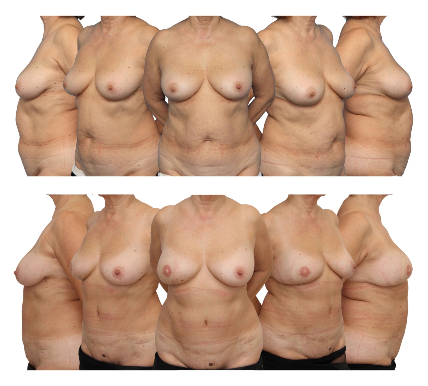 Na sliki je bolnica z odloženo rekonstrukcijo s telesu lastnim tkivom s trebuha, po predhodni totalni mastektomiji. Vidne so brazgotine okoli dojke, na trebuhu in okoli popka ter končni rezultat iz več pogledov.
