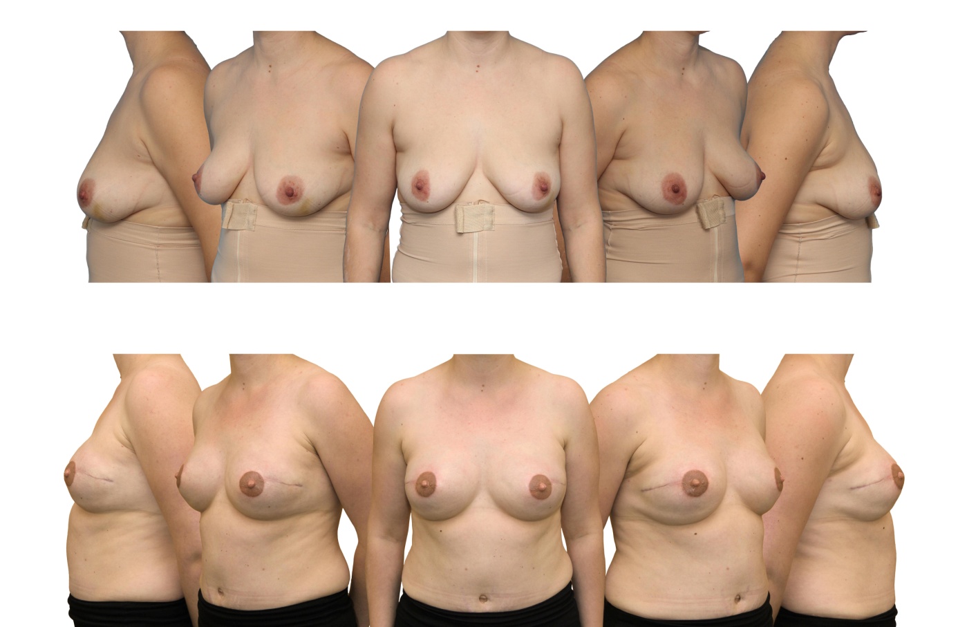 Slika prikazuje rekonstrukcijo v dveh stopnjah, in sicer v zgornji vrsti je bolnica pred rakom dojke, v drugi vrsti pa bolnica po obojestranski dvostopenjski rekonstrukciji s tkivnim razširjevalcem in anatomsko oblikovanim silikonskim vsadkom