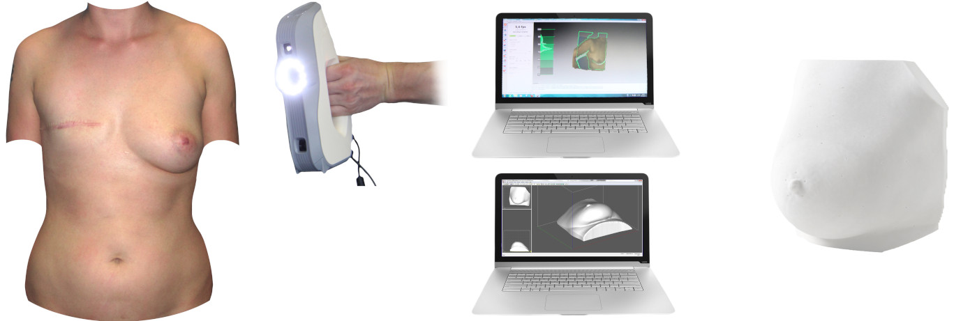 Slika prikazuje primerno bolnico za 3D-modeliranje in 3D-kamero, s katero opravimo posnetek, nato preko računalniškega programa izdelamo kopijo sosednje zdrave dojke, jo natisnemo ter pridobimo kalup.