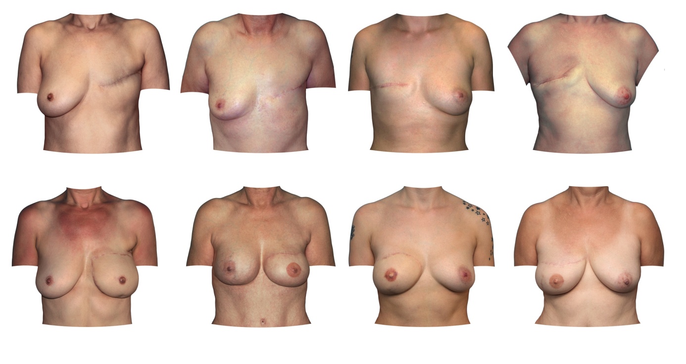 V zgornji vrsti so bolnice po predhodni mastektomiji, v spodnji vrsti pa rezultati rekonstrukcij s tehniko 3D-tehnologije in modeliranja.