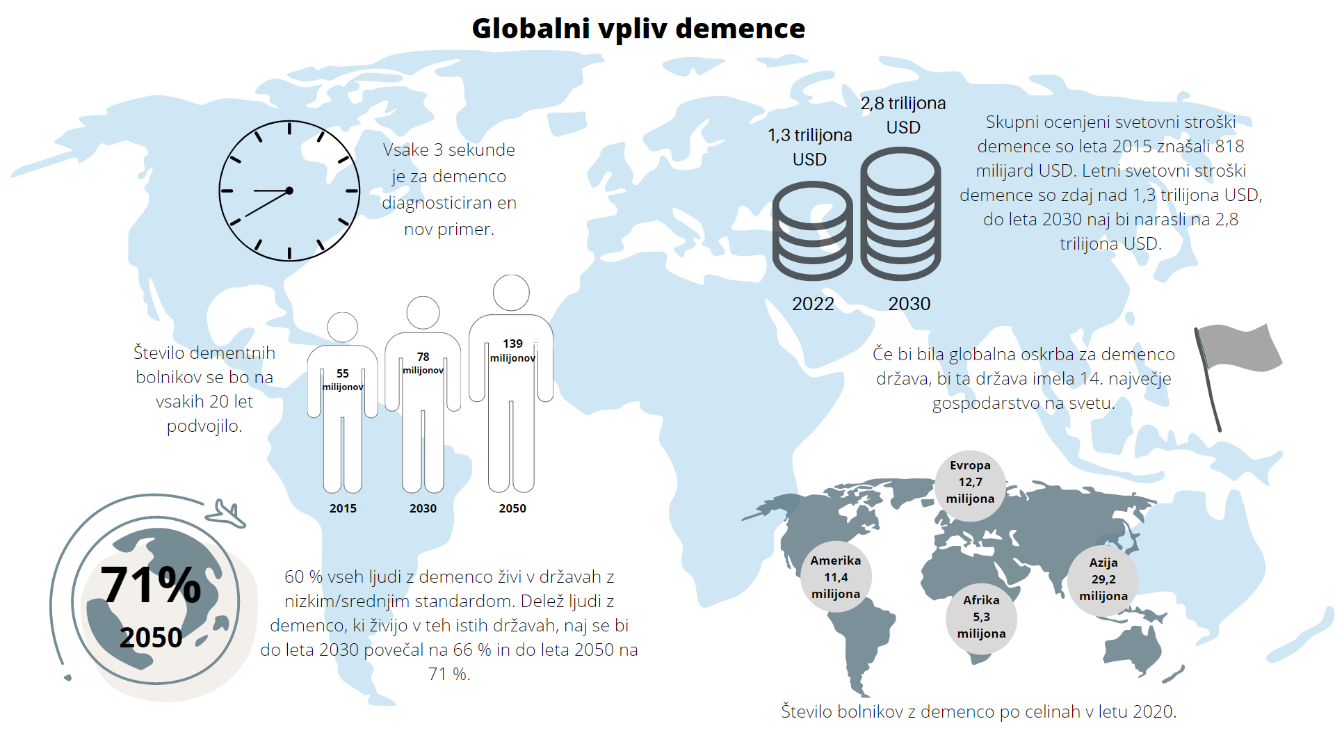 - Že 60 % ljudi z demenco živi v državah z nizkimi in srednjimi dohodki, do leta 2050 pa se bo ta delež povečal na 71 %.