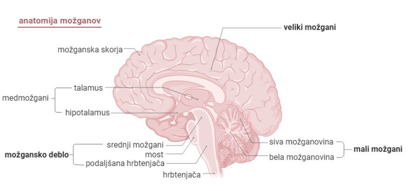 Človeške možgane sestavljajo veliki možgani, mali možgani in možgansko deblo. Veliki možgani se delijo na levo in desno možgansko poloblo. Predel možganov iz sive možganovine se imenuje možganska skorja, ki predstavlja povrhnji del malih in velikih možganov. Možganska skorja je nagubana in zvita v vijuge in jo potrebujemo za izvajanje hotenih gibov, za razumevanje jezika, govorjenje in višje funkcije, kot sta razmišljanje in pomnjenje. Mnogo teh funkcij opravljata obe strani možganov, toda nekatere so predvsem izraz delovanja le ene od obeh polobel. Male možgane sestavljajo možganska skorja in možganska jedra. To so področja, ko se siva možganovina zajeda globlje v belo možganovino. Osnovna funkcija malih možganov je nadzor gibanja, drže in ravnotežja. Možgansko deblo se deli na podaljšano hrbtenjačo, most in srednje možgane. Podaljšana hrbtenjača je, kot že ime pove, podaljšek hrbtenjače. V njej so omrežja živčnih celic, imenovanih nevronov, ki sestavljajo centre za nadzor življenjskih funkcij, kot sta dihanje in krvni tlak. Srednji možgani vsebujejo skupine nevronov, ki z aksoni segajo v možganski polobli, kar uravnava funkcije, kot so spanje, pozornost in nagrajevanje. Medmožgani se delijo v dva zelo različna predela, imenovana talamus in hipotalamus. Talamus posreduje impulze iz vseh čutilnih sistemov v možgansko skorjo, ki nato pošilja sporočila nazaj v talamus. Ta vidik povratne povezave je vznemirljiva značilnost možganov: informacija ne potuje samo v eno smer. Hipotalamus nadzira funkcije, kot sta hranjenje in pitje, uravnava pa tudi izločanje hormonov, vpletenih v spolne funkcije.