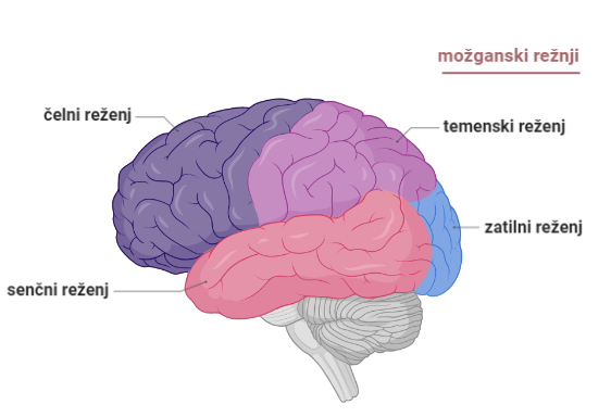 Možgani so razdeljeni tudi na več režnjev. Frontalni ali čelni reženj je odgovoren za reševanje problemov in presojo ter motorično delovanje. Parietalni ali temenski reženj upravlja občutljivost, rokopis in položaj telesa. Temporalni ali senčni reženj sodeluje pri spominu in sluhu, medtem ko je okcipitalni ali zatilni reženj odgovoren za obdelavo vidnih zaznav.